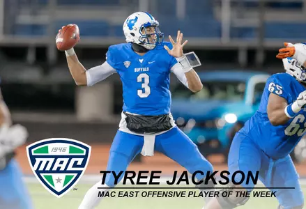 CLEVELAND, OH – University at Buffalo quarterback Tyree Jackson was named the Mid-American Conference East Division Offensive Player of the Week, the league announced on Monday. It is the seventh time this season a UB player has been named Player of the Week and Jackson is the sixth different Bull to earn the honor.