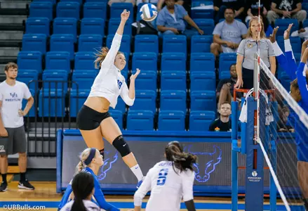 Buffalo trailed 16-10 in the second set when it scored five straight points, including a pair of service aces from junior Larra Bickelhaupt. The set was tied at 21-21 when the Bulls scored the final four points, two of those coming on Prokudina kills to take the set and tie the match up at 1-1.