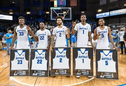 BUFFALO, NY – It was an emotional evening for the University at Buffalo men's basketball team on Friday night as the Bulls celebrated their past, present, and future during an emphatic 84-73 victory over Bowling Green to cap off the regular season. The Bulls set school records for wins in a season and conference victories as UB tied Tennessee for the nation's longest home winning streak at 26.